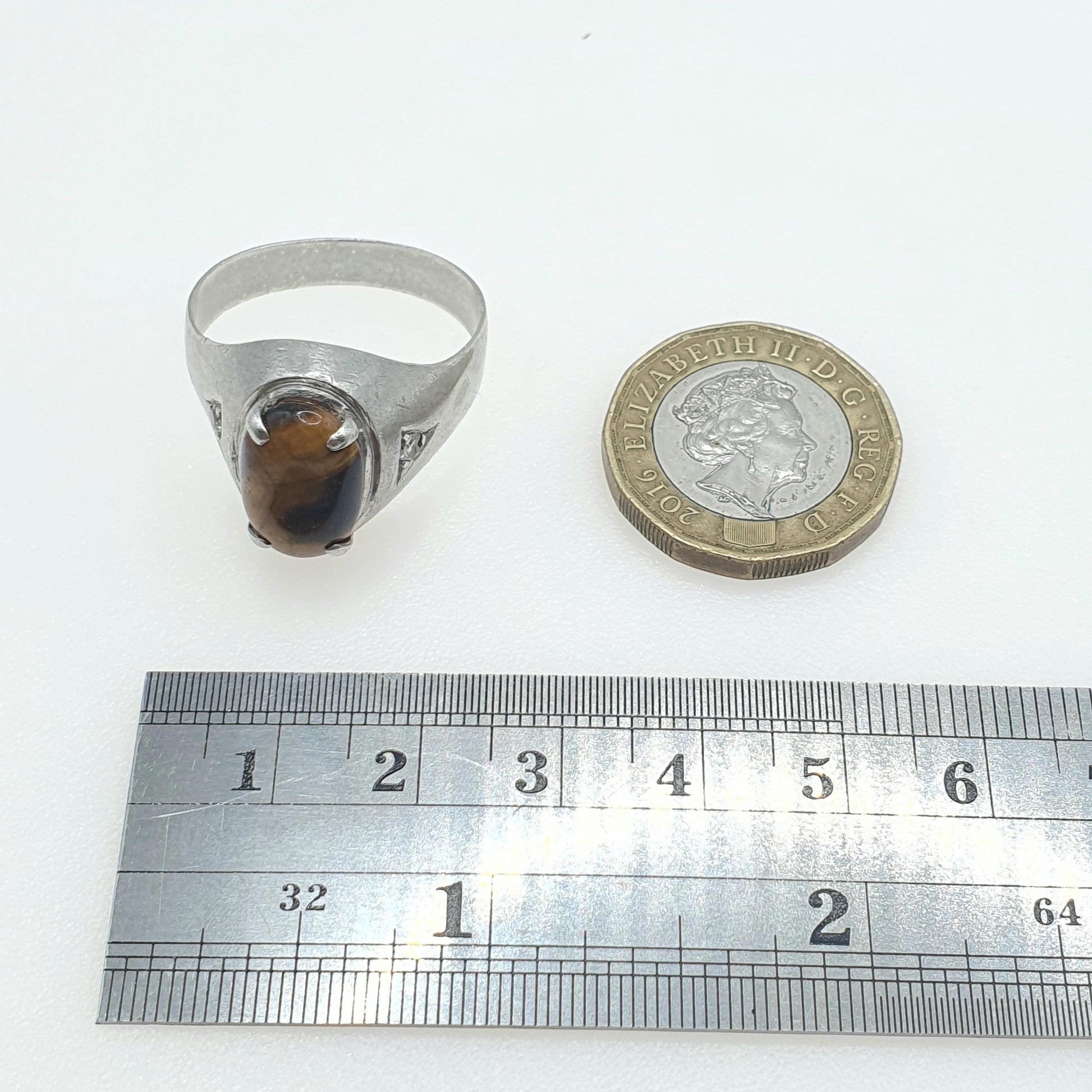 DESCRIPTION: A striking large vintage solid silver tiger eye & CZ signet ring. The ring boasts beautiful brown and amber tones with a natural tiger stripe effect across the stone. The ring sizes at approx. UK X.5 or US 11.75 and weighs approx. 8.41g. As to be expected with the items age, it isn't stamped/hallmarked, it tests for high grade silver (800+).