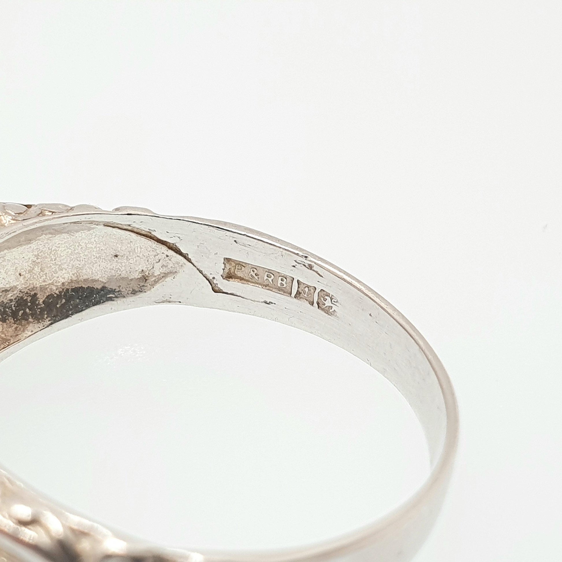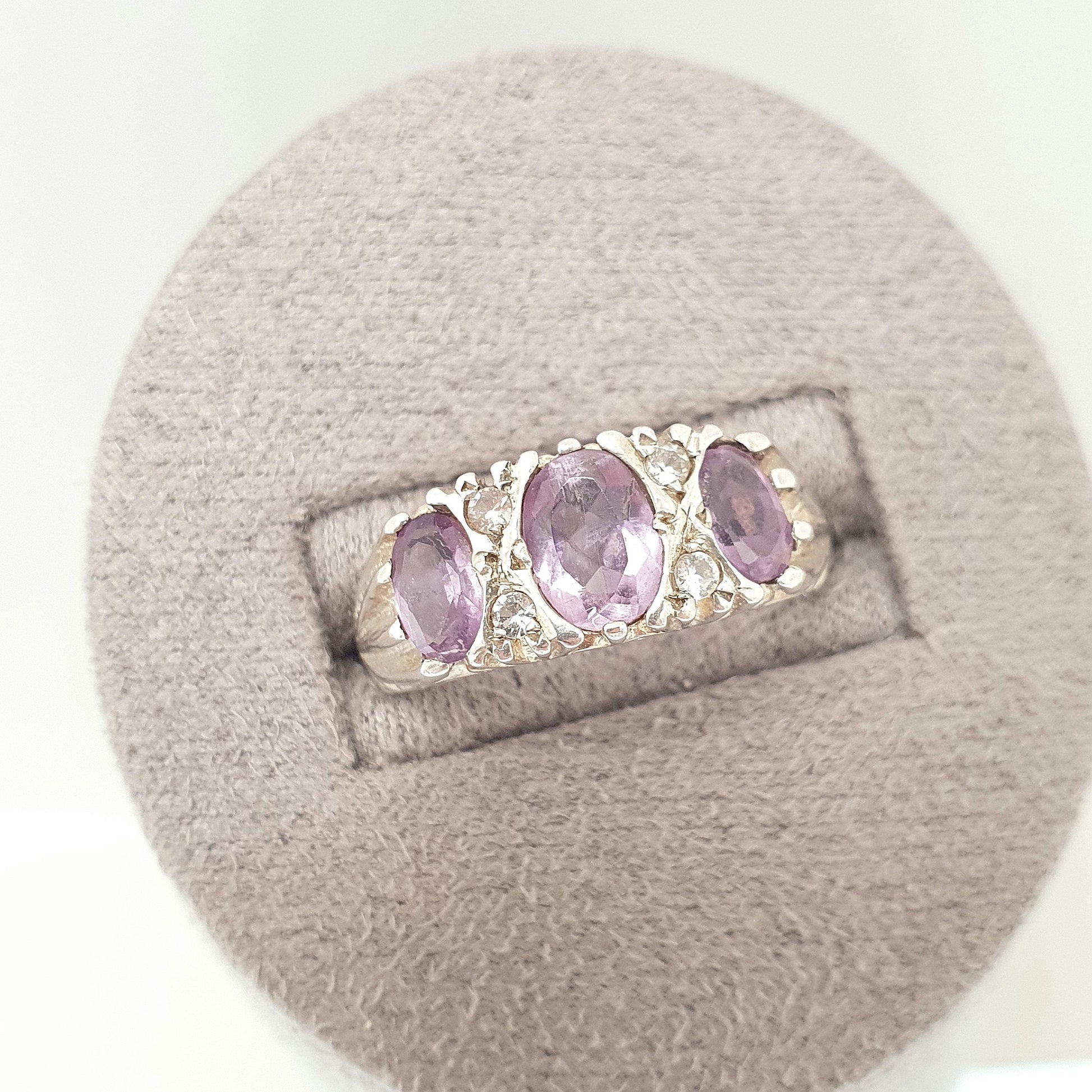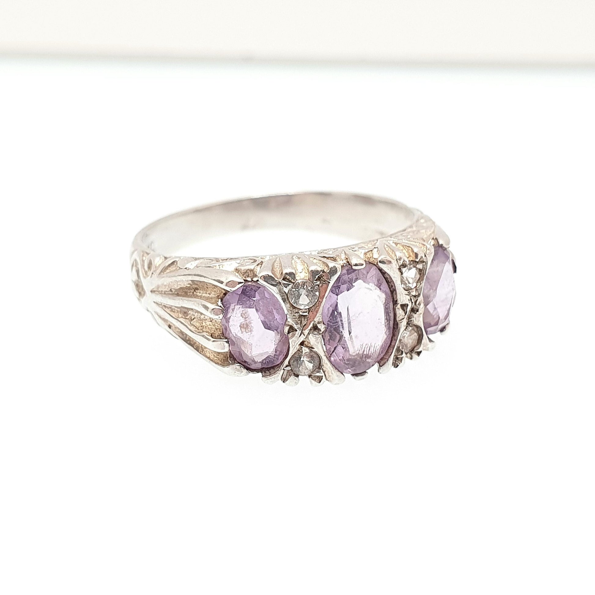 DESCRIPTION: A stunning and genuine vintage sterling silver gypsy ring, adorned with amethyst and white quartz gemstones (100% tested). It sizes at approx. UK Q.5 or US 8.25 and weighs approx. 3.15g. The ring is hallmarked for sterling silver (date mark has worn). The central amethyst has a dark line in its, surface, it looks like a natural line to me.