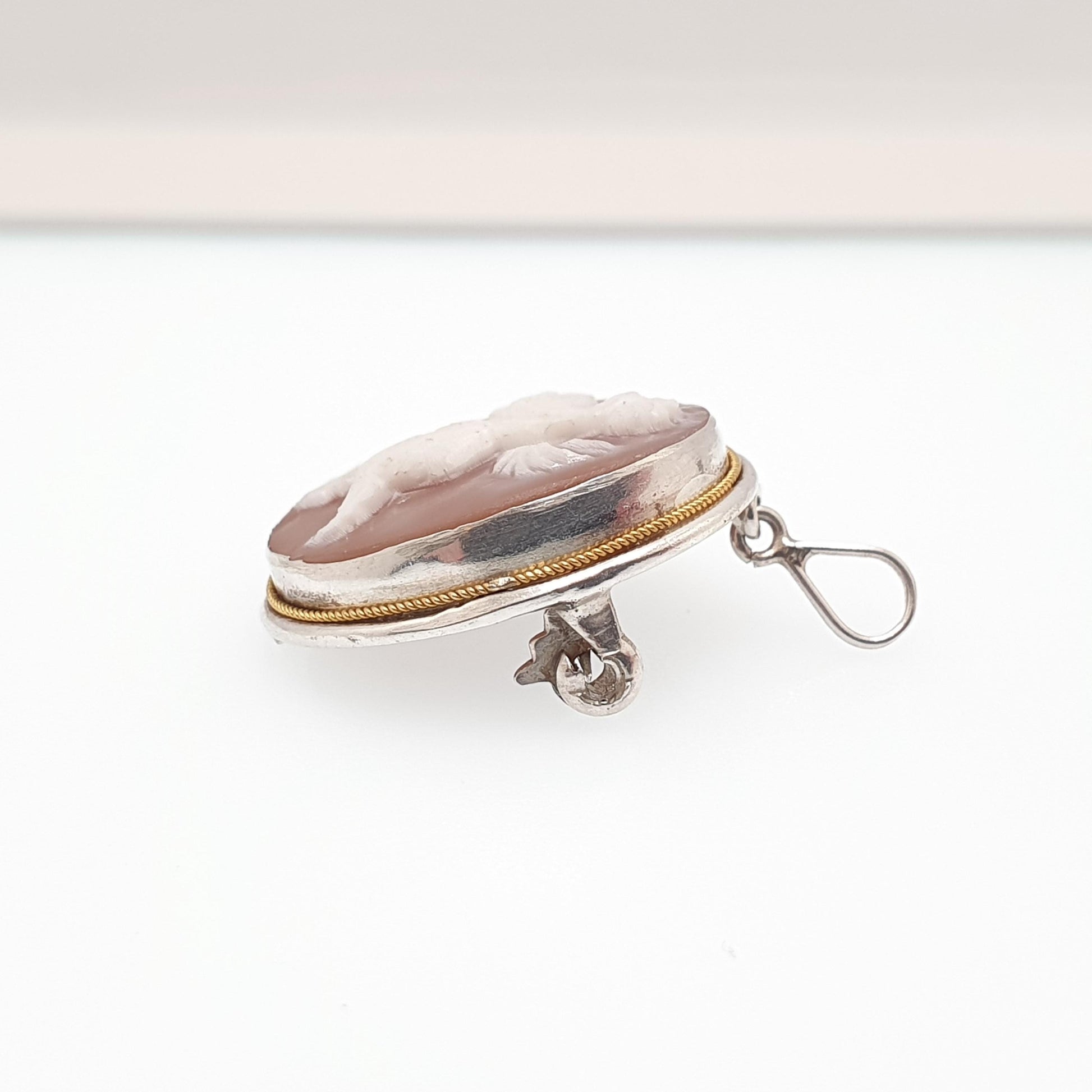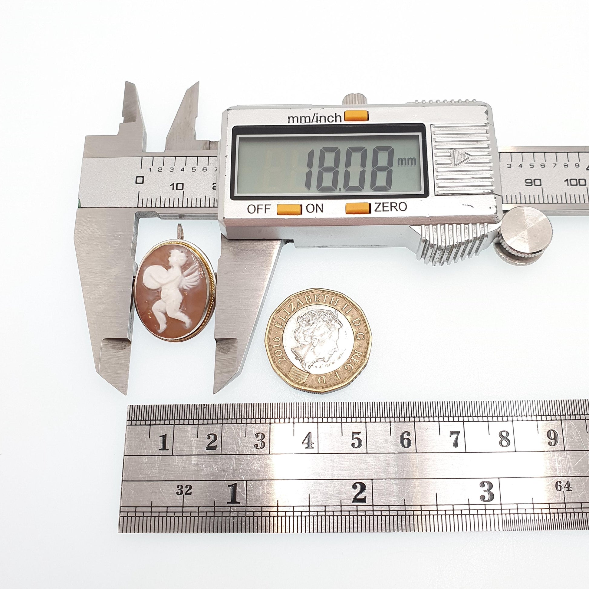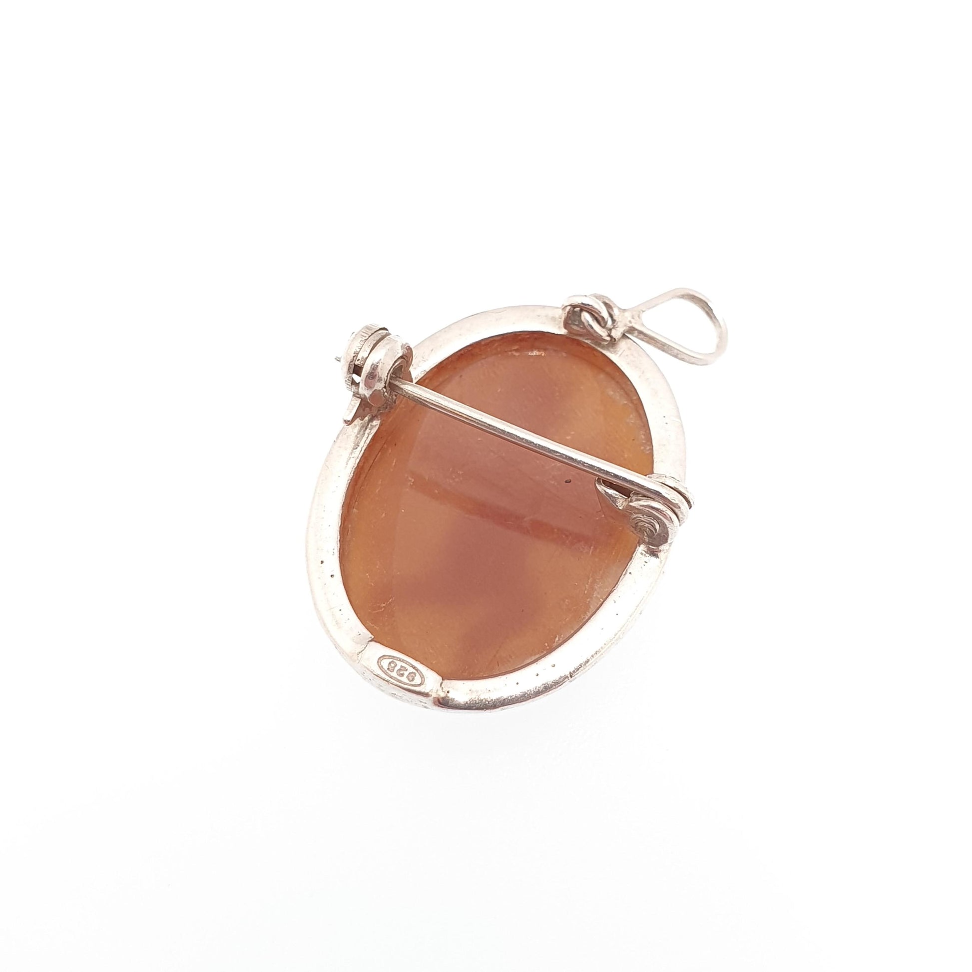DESCRIPTION: A beautiful vintage genuine shell cameo pendant/brooch, mounted in sterling silver. The cameo depicts a sweet cherub. The item is stamped "925" and weighs approx. 3.54g. The size dimensions are in the later photos.