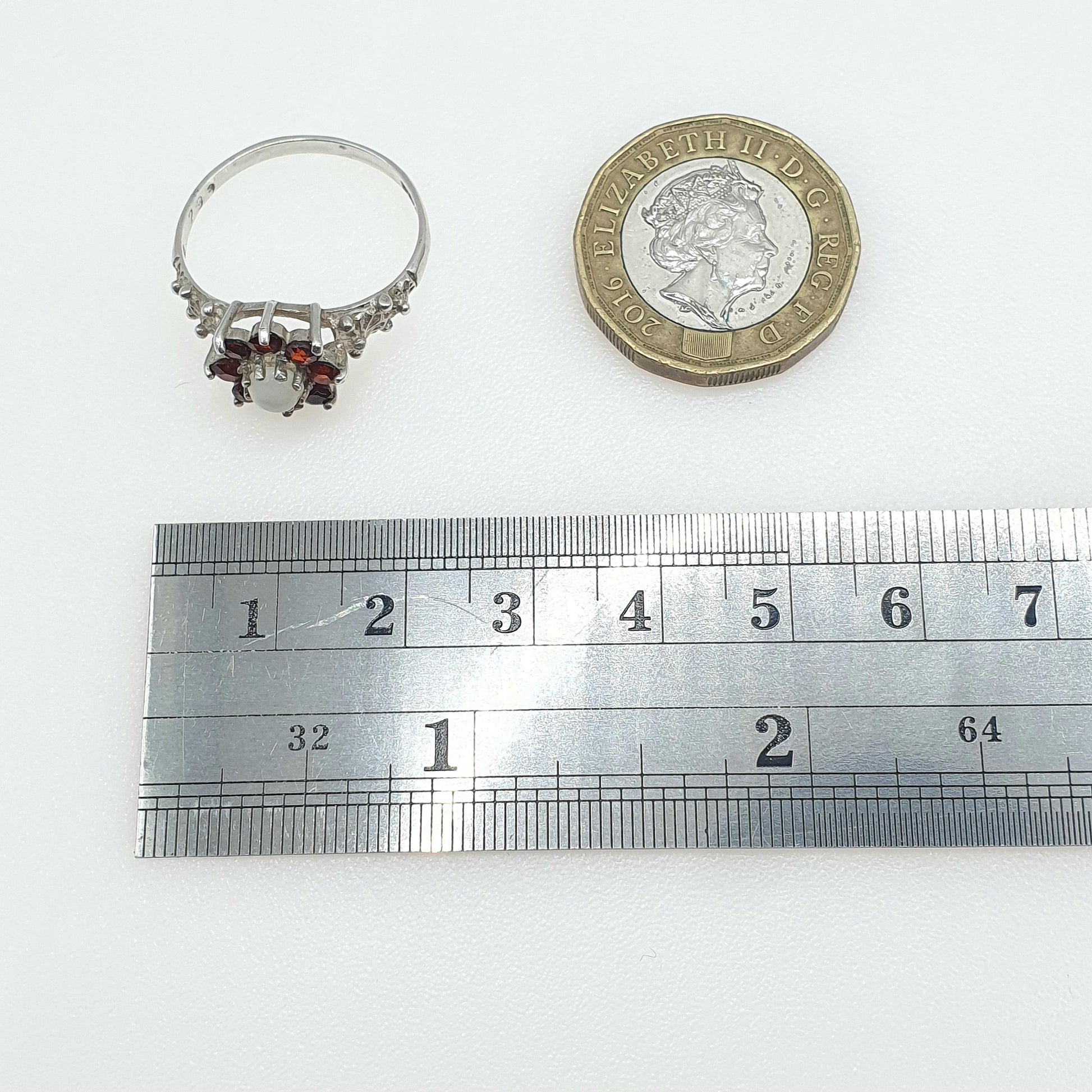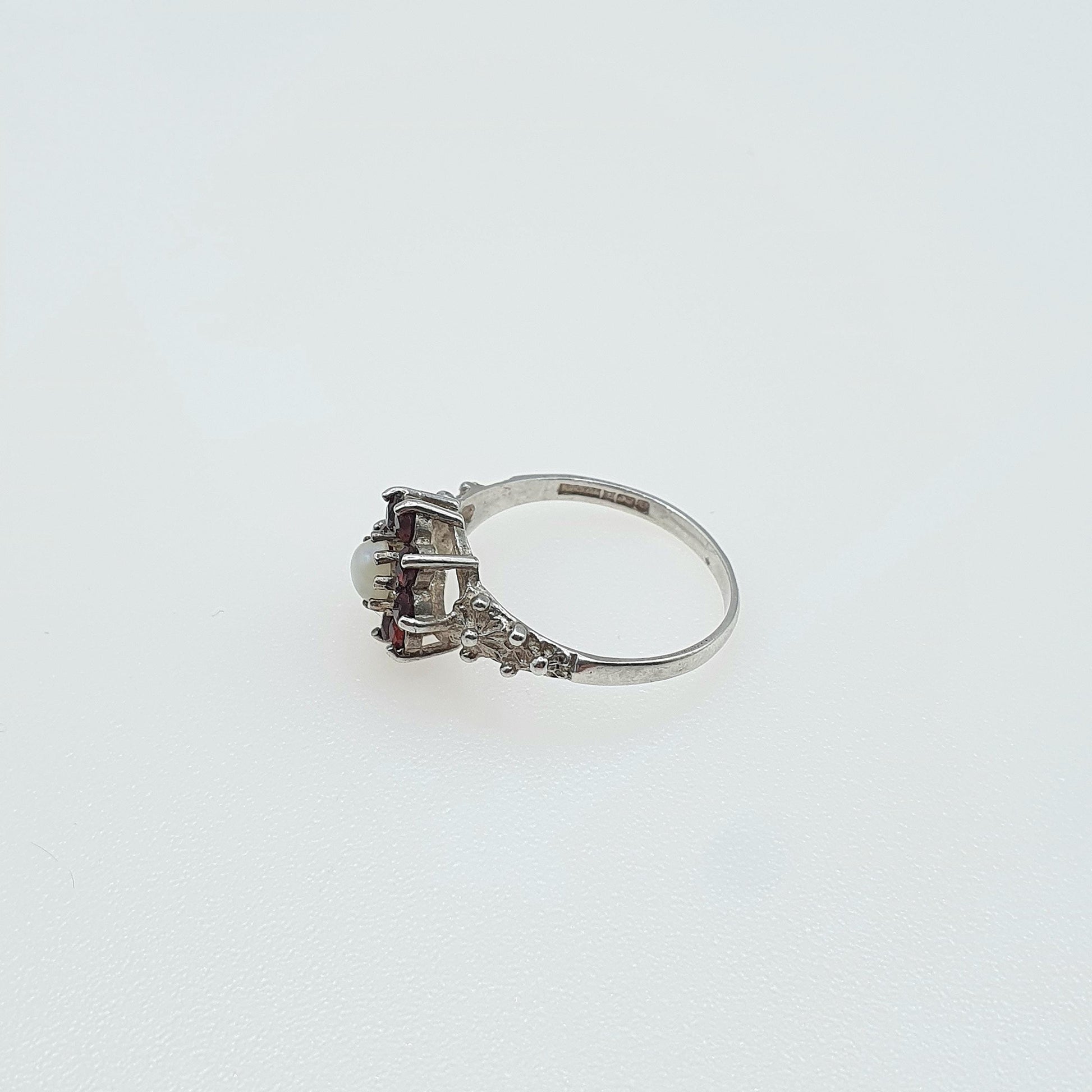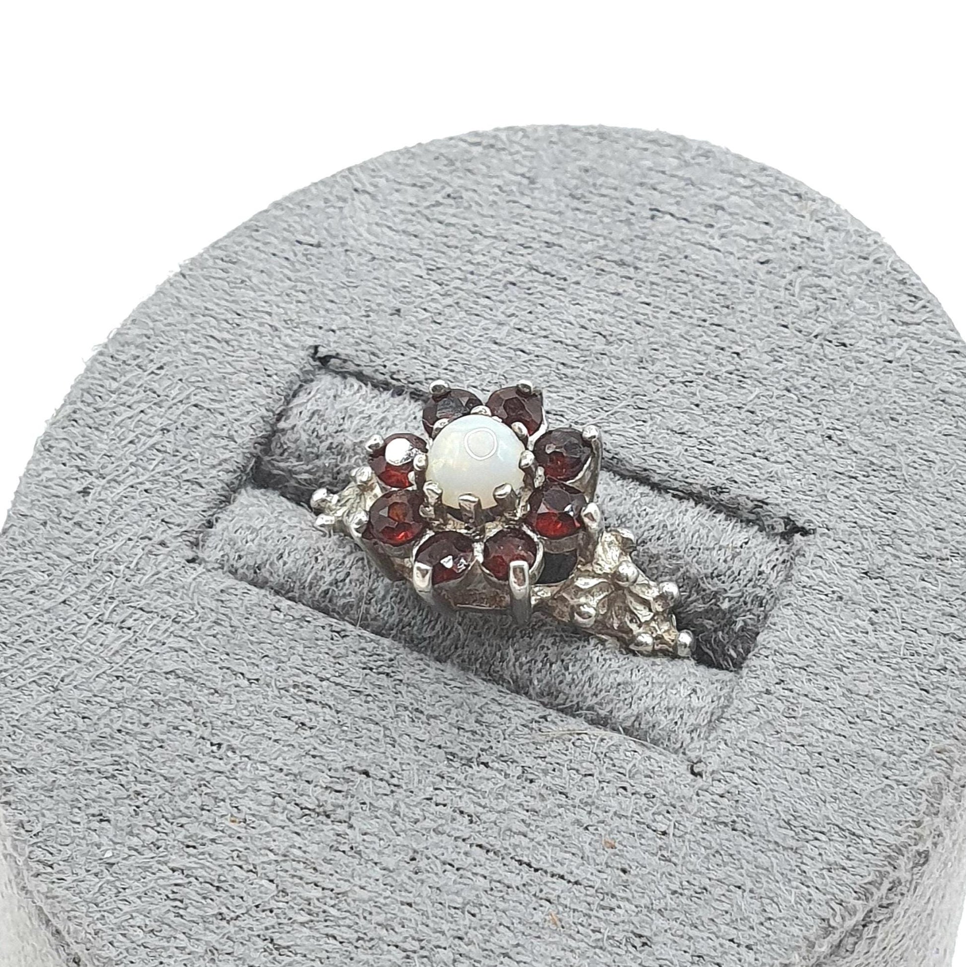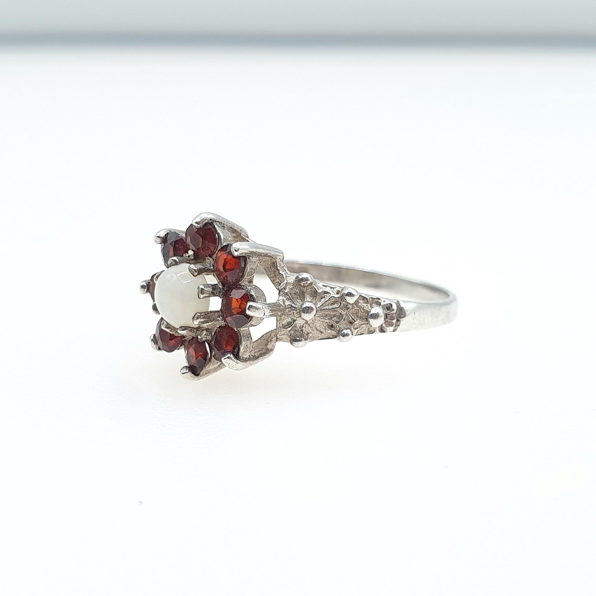 DESCRIPTION: A cute and genuine 1970s vintage sterling silver ring, adorned with real garnets and a white opal (100% tested). It sizes at approx. UK Q.5 or US 8.25, it weighs approx. 2.13g and the size dimension are in the later photos. The item is hallmarked for sterling silver, dating to 1979.