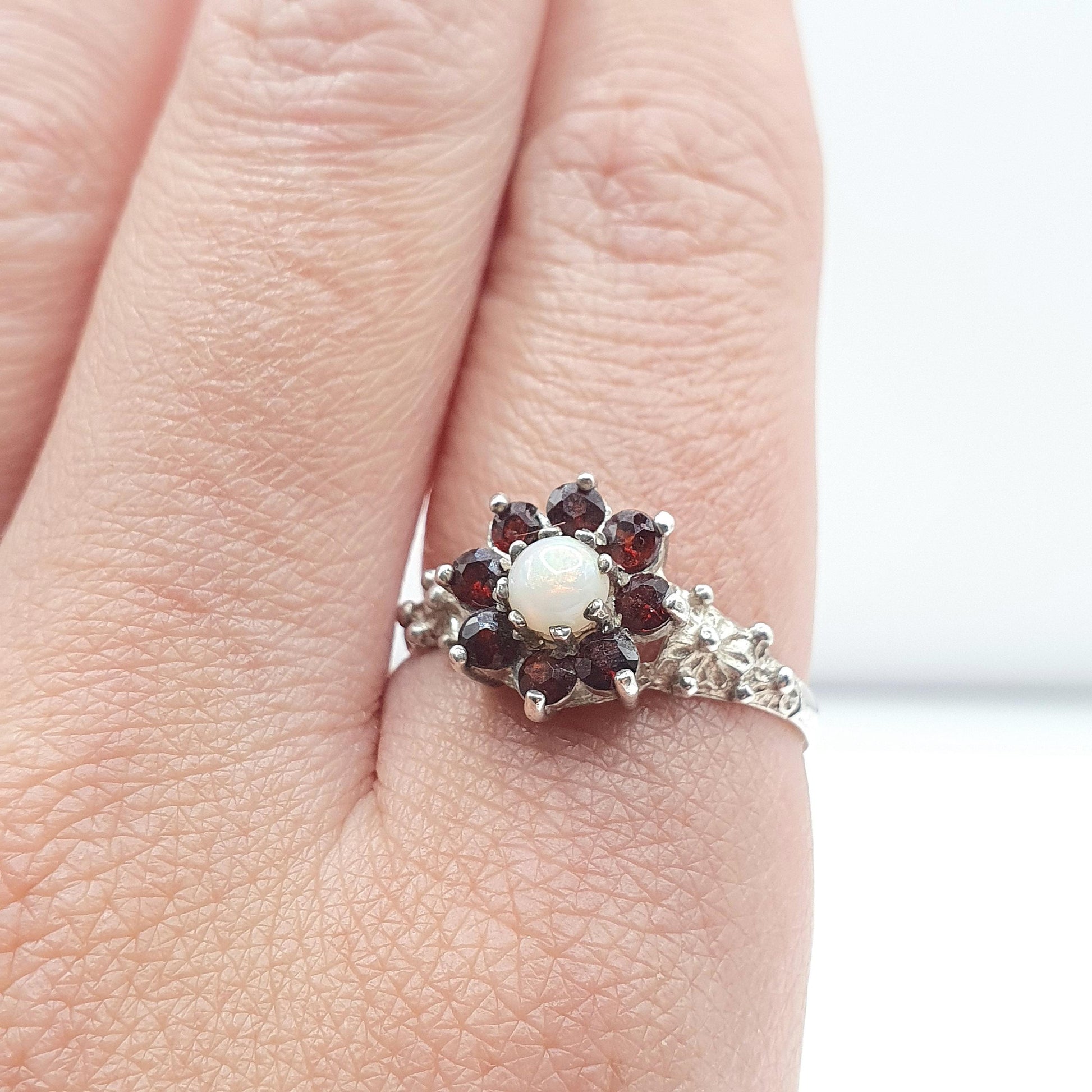 Vintage Sterling Silver Garnet & Opal Cluster Ring Red Gemstone 1979 Hallmark Womens Girls Jewelry Jewellery