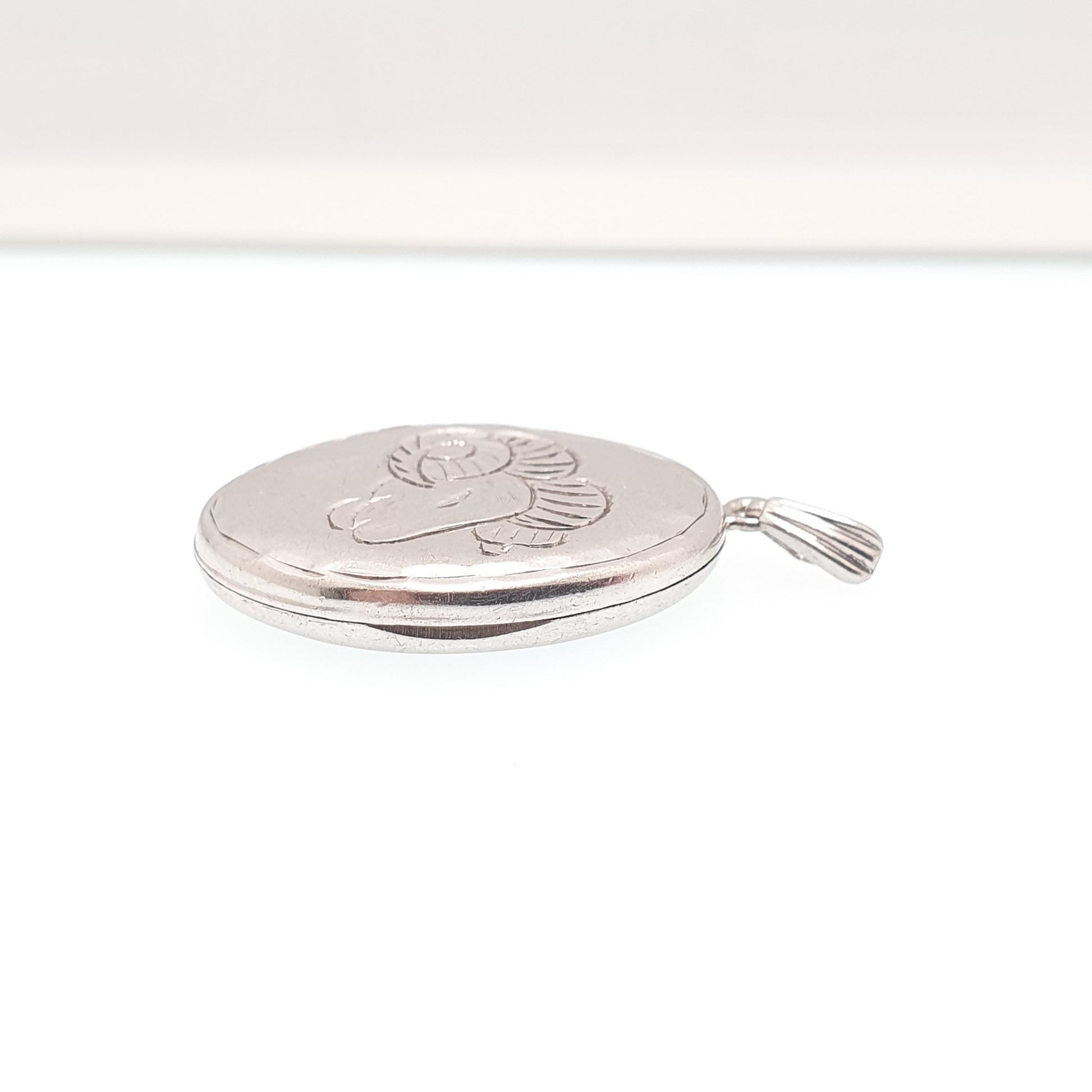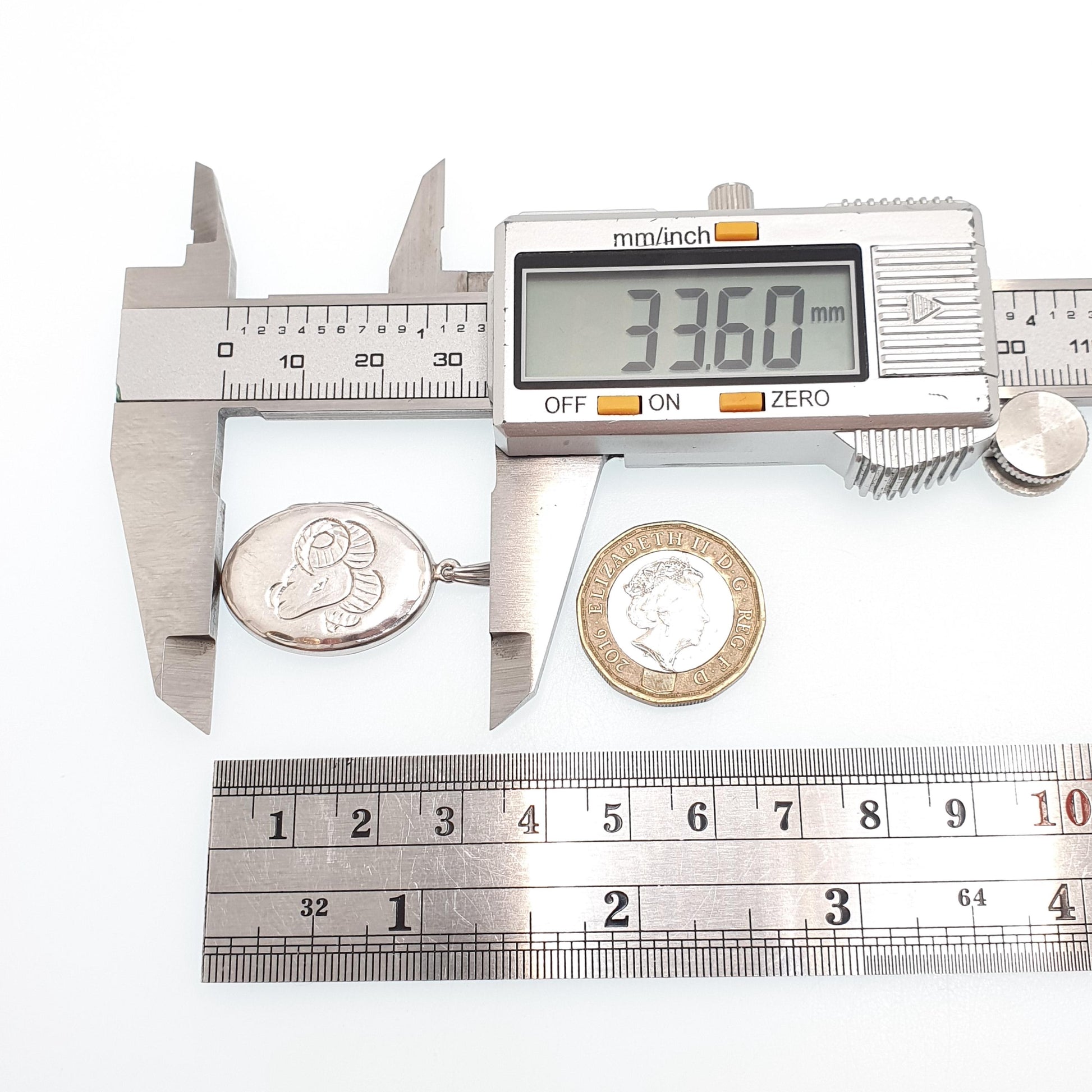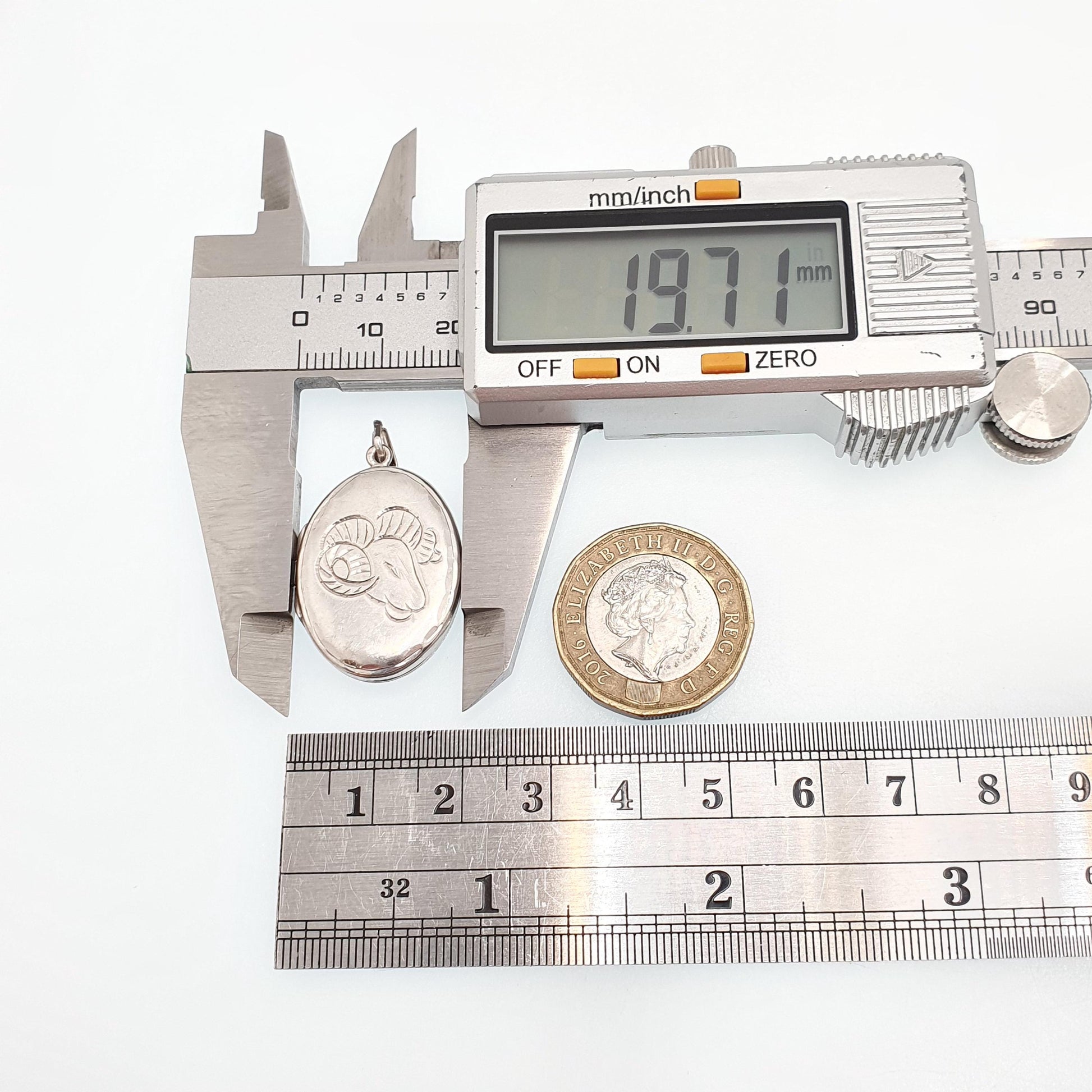 DESCRIPTION: A vintage sterling silver locket, with the Aires ram engraved into the face. It's hallmarked for sterling silver dating to 1978 and opens/closes well. The inside has a dark matte finish compared to the outside. It weighs approx. 5.20g and the size dimensions are in the later photos.