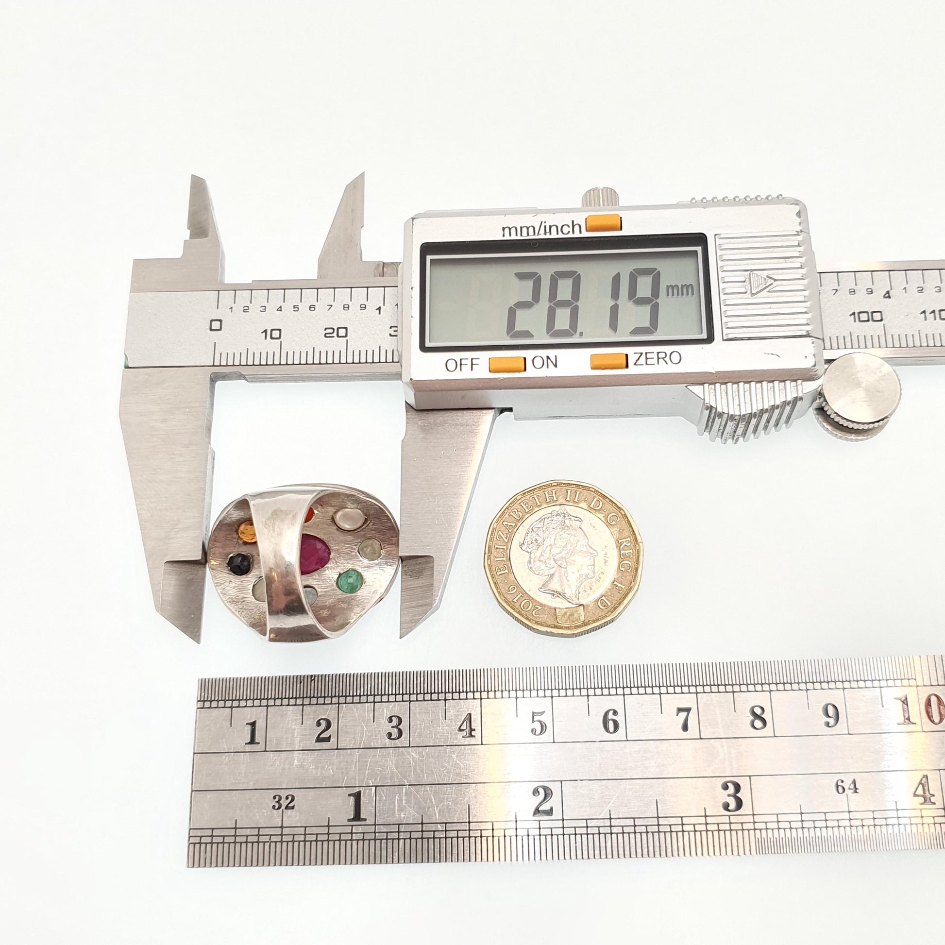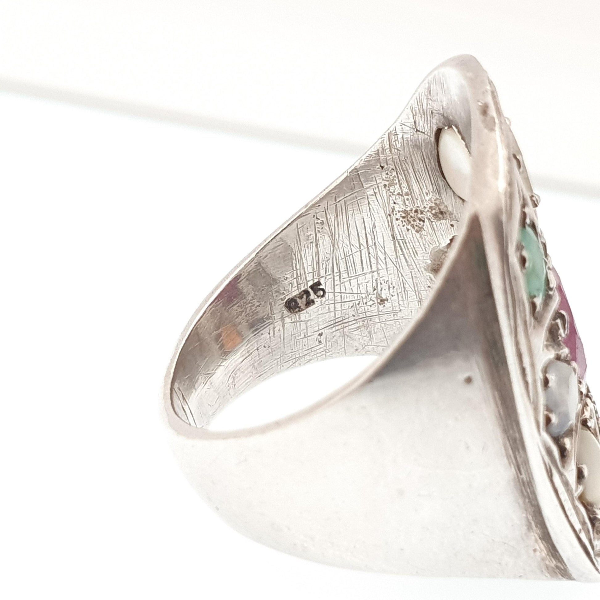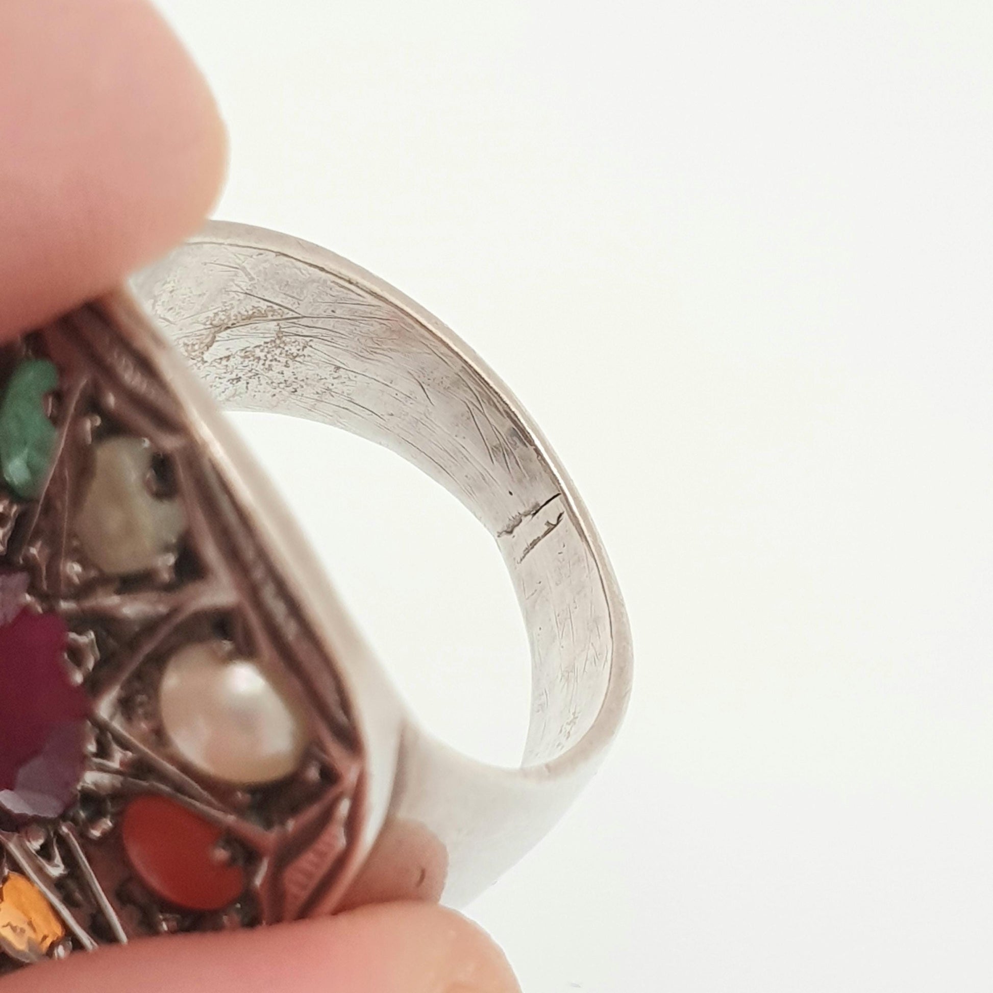 DESCRIPTION: A stunning and genuine vintage sterling silver Navaratnam ring, adorned with various genuine gemstones. The central gemstone is a ruby, then starting from 12 o'clock and working clockwise they're: diamond, pearl, coral, hessonite, sapphire, cats eye, sapphire, emerald. It sizes at approx. UK Q or US 8 and weighs 12.81g. The item is stamped "925" for sterling silver.