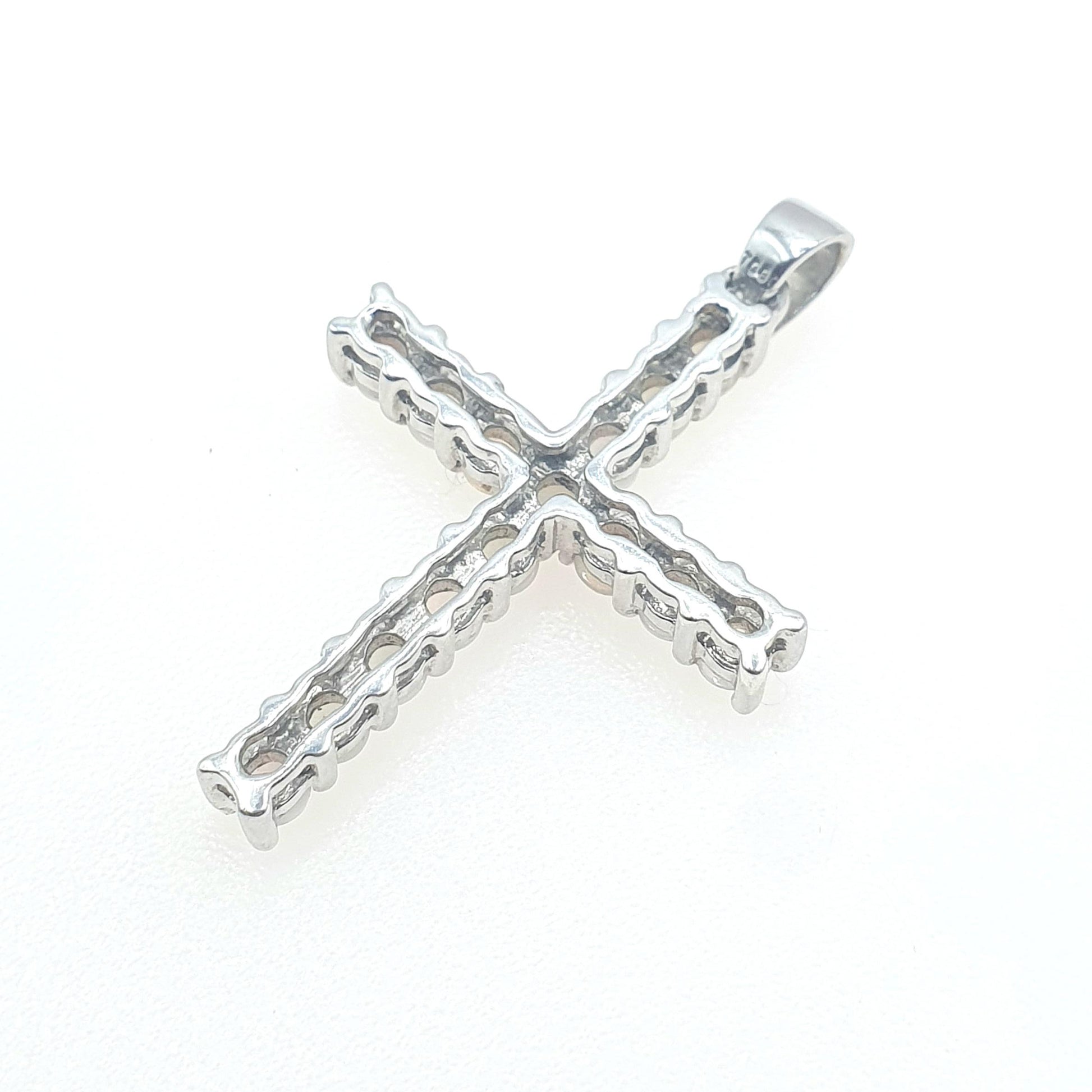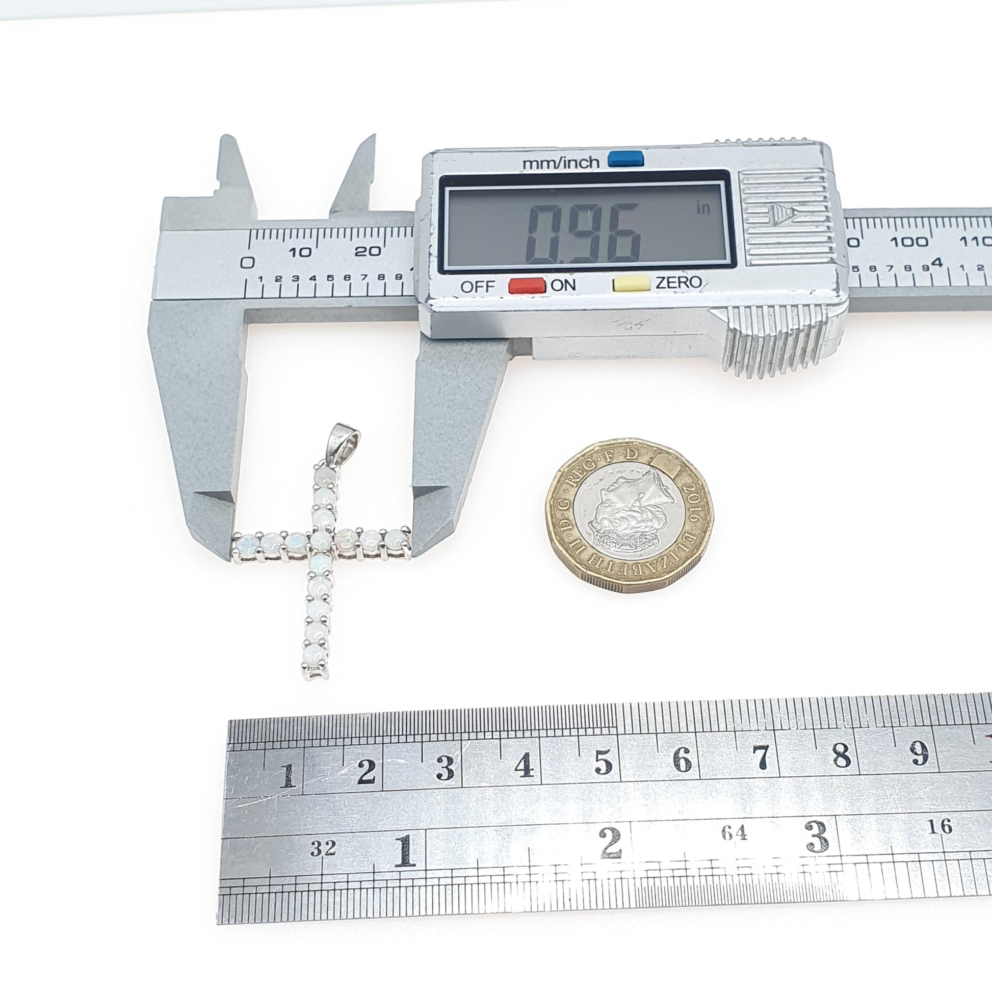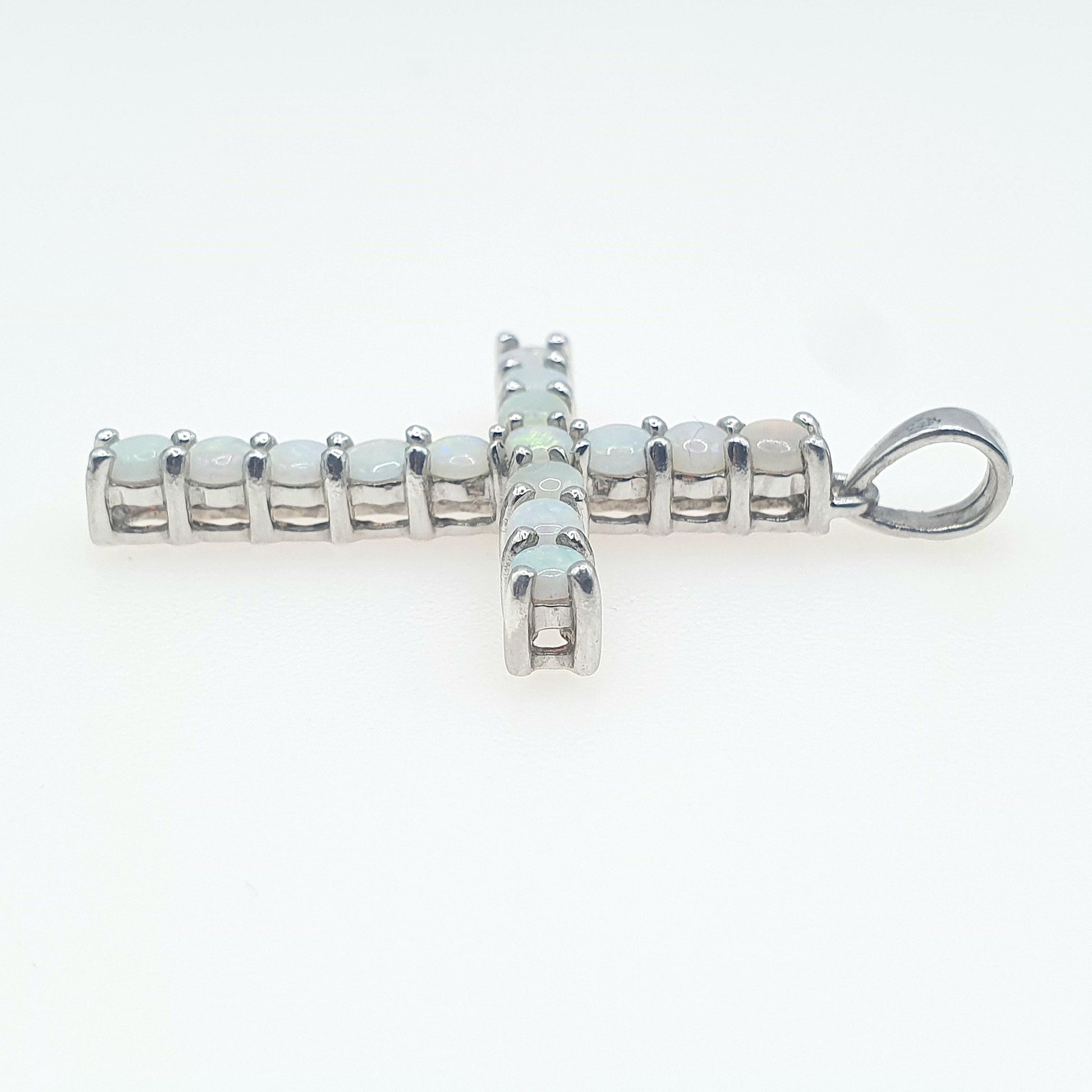 DESCRIPTION: A genuine vintage sterling silver crucifix pendant, adorned with genuine white opals. The stones are all in tact and boast beautiful hues of green and blue with flashes of orange. The item is stamped "925" and made by TGGC. It weighs approx. 3.27g and the size dimensions are in the latter photos.