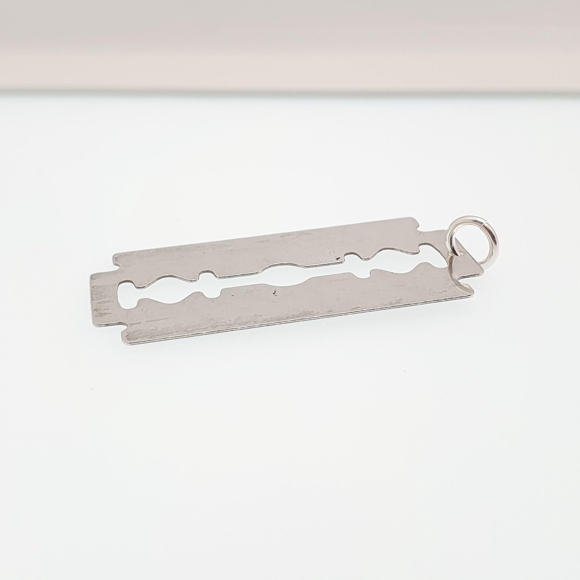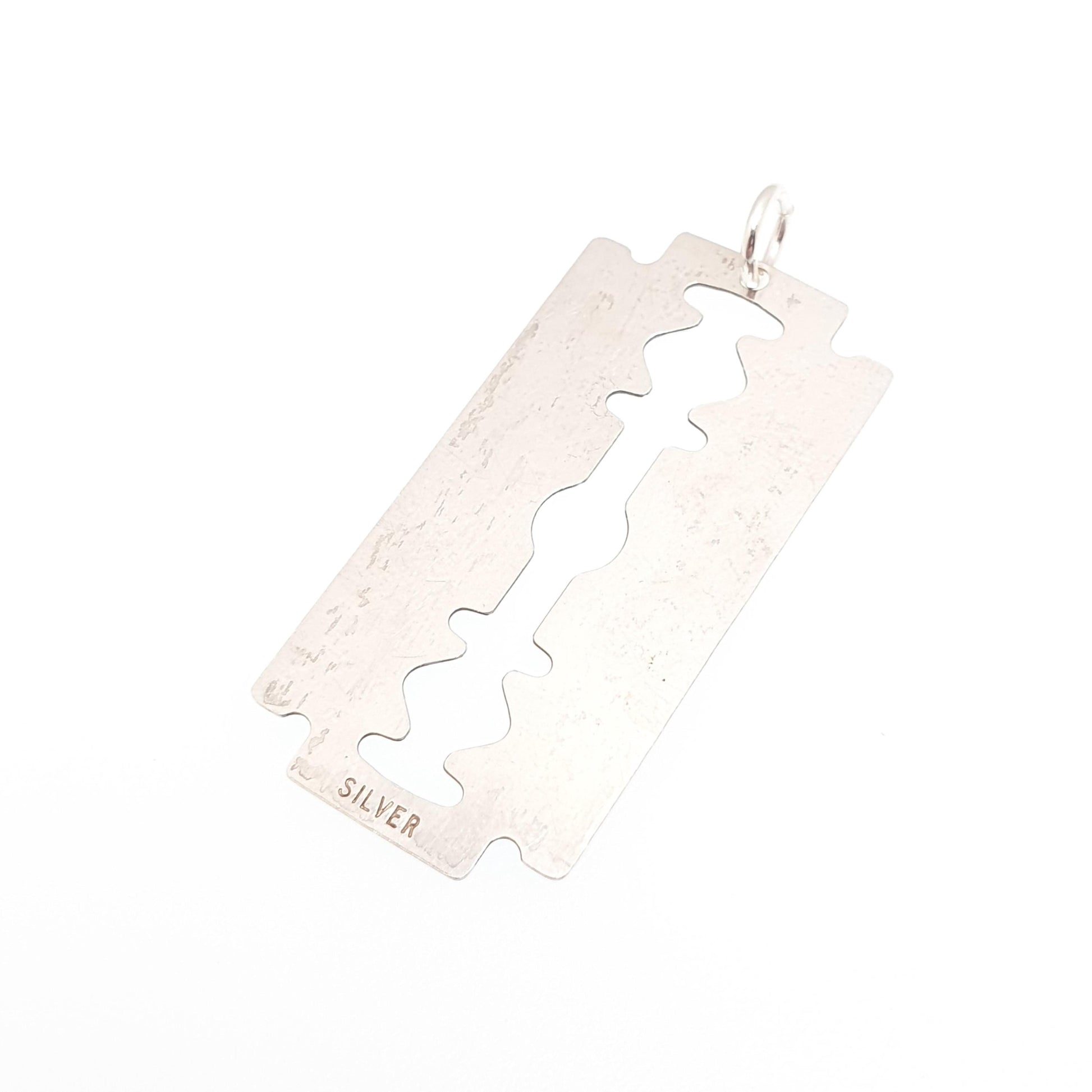 DESCRIPTION: A brilliant and genuine 1970s vintage sterling silver razor blade pendant (it's only cosmetic and not suitable to shave with!). The pendant is stamped "SILVER" and tests for sterling 925 silver. It weighs 2.33g and the size dimensions are in the later photos. As to be expected with age and use, the item has marks and patina it, see pictures/video.