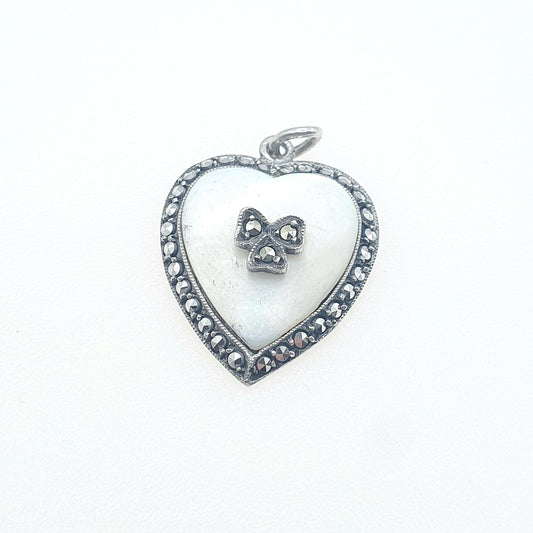 Antique Art Deco Solid Silver Heart Clover Necklace Marcasite Mother of Pearl Pendant Charm Jewelry Vintage Jewellery