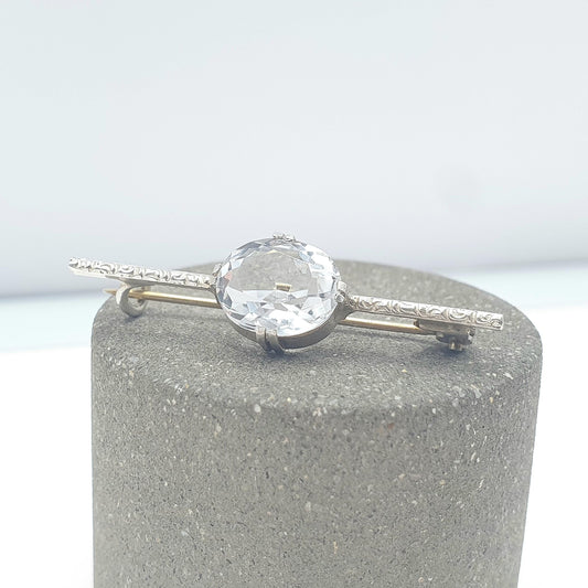 Antique Solid Silver Rock Crystal Brooch Oval Cut White Quartz Bar Pin 1910s Womens Unisex Jewelry Jewellery Vintage